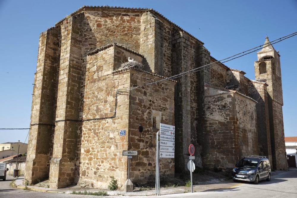 El coro del templo es obra del cantero Pedro Gómez, quien también intervino en las cacereñas Casa del Sol, iglesia de Santiago e iglesia de San Mateo. Ocupa el cuarto tramo y el frontal está rematado con una balaustrada de piedra, soportes cilíndricos y cuatro pedestales iguales a las pilastras inferiores. En el centro, un escudo de la Casa Monroy "vigila" el impresionante retablo herreriano de la iglesia.